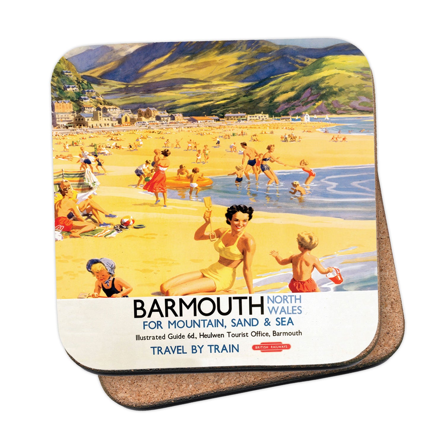 Protect your table surfaces with these durable cork coasters. Beautiful design of Barmouth North Wales for Mountain, Sand and Sea. Perfect for any Railway Posters enthusiast.