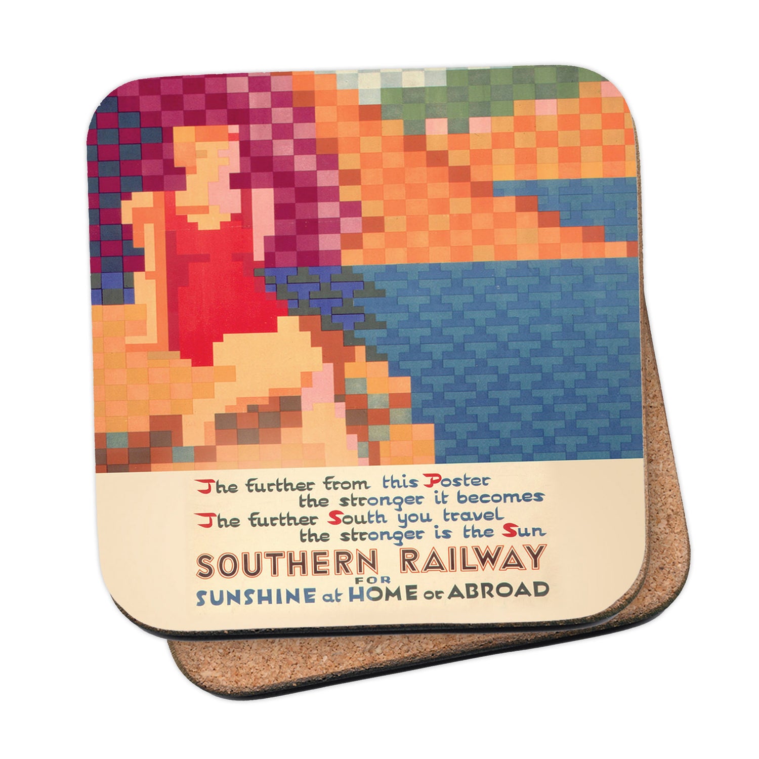 Protect your table surfaces with these durable cork coasters. Beautiful design of Southern Railway for Sunshine at Home or Abroad. Perfect for any Railway Posters enthusiast.