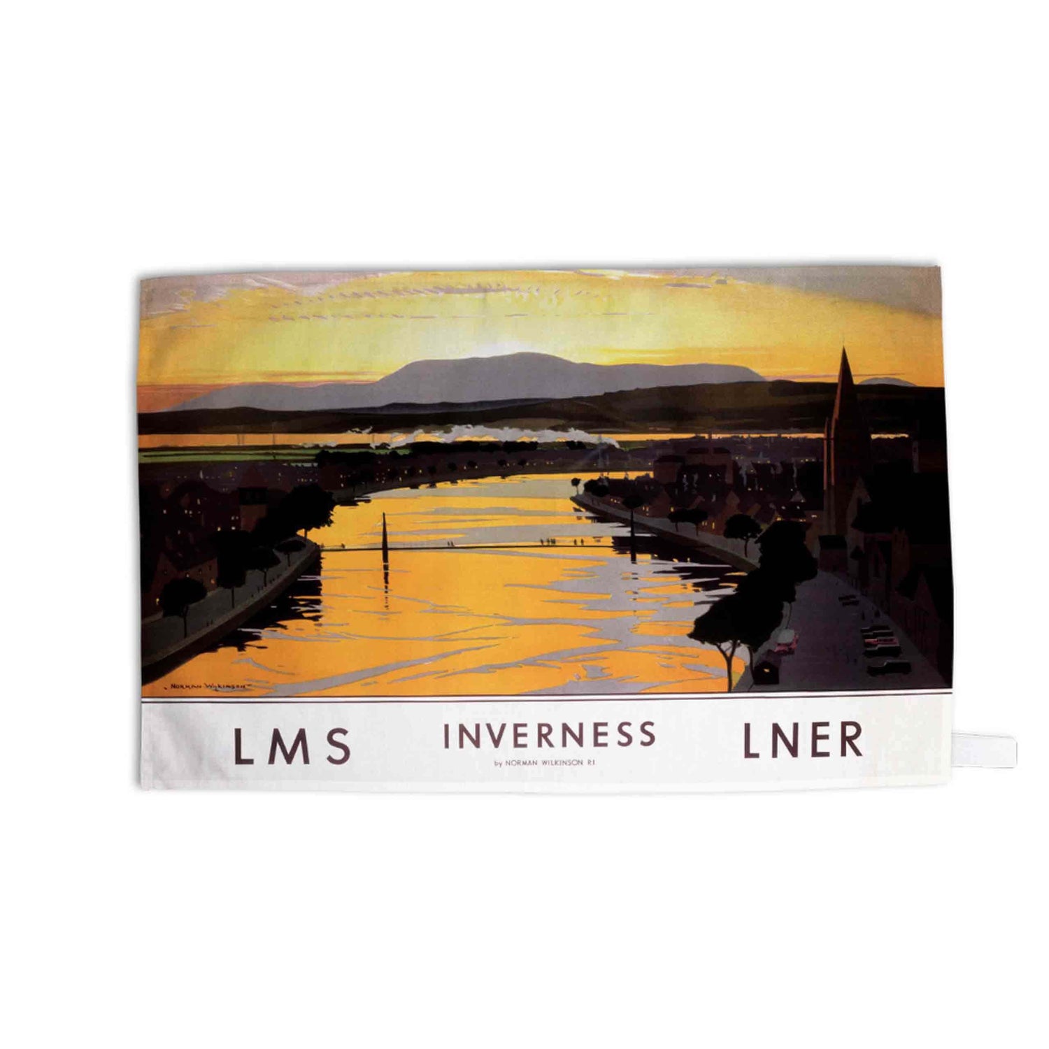Classic Railway Poster Design on high-quality Tea Towel. This vintage rail design of Inverness Sunset will look great in any kitchen. All made from 100% cotton and hemmed on all four sides along with a handy hanging loop.