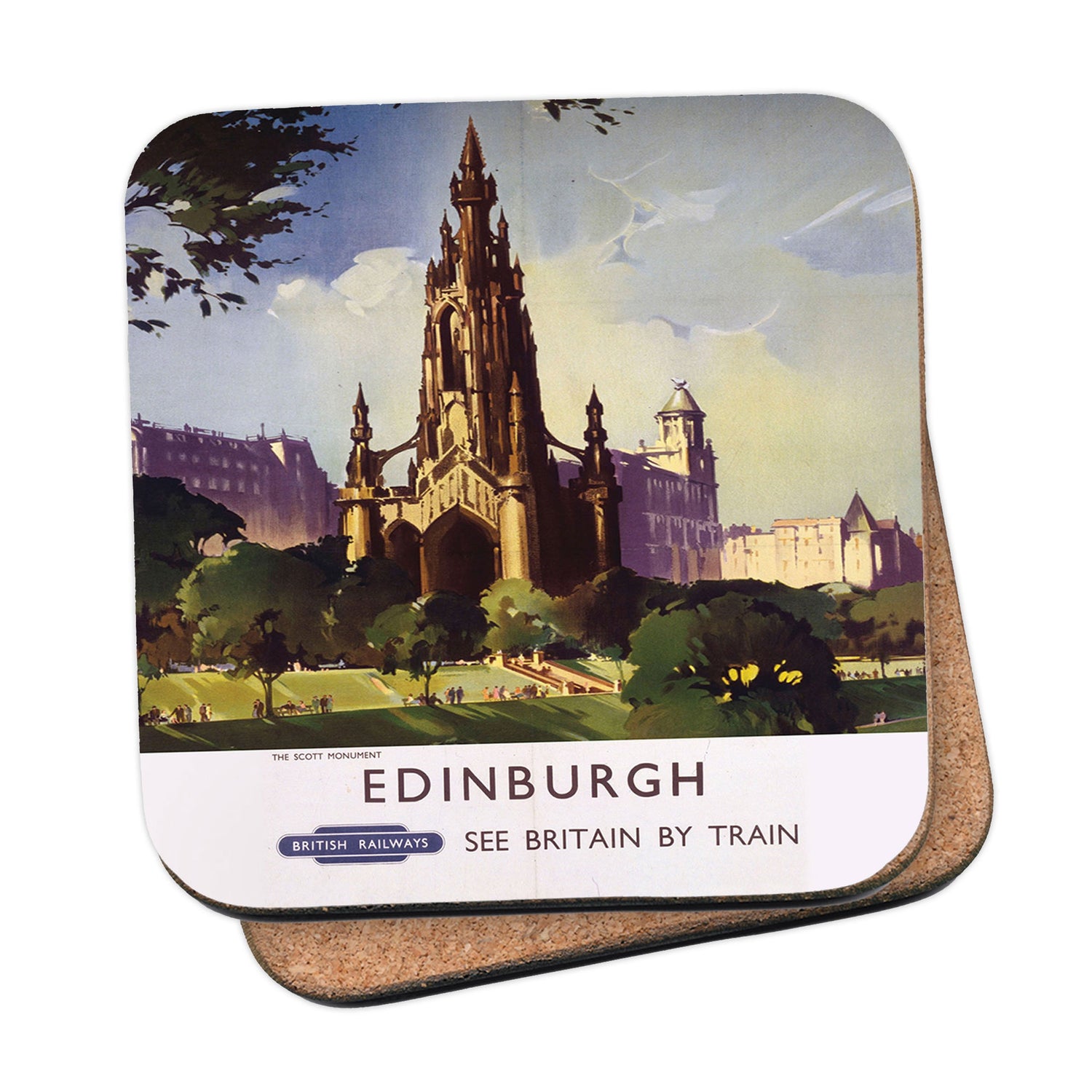 Protect your table surfaces with these durable cork coasters. Beautiful design of The Scott Monument - Edinburugh British Railways. Perfect for any Railway Posters enthusiast.