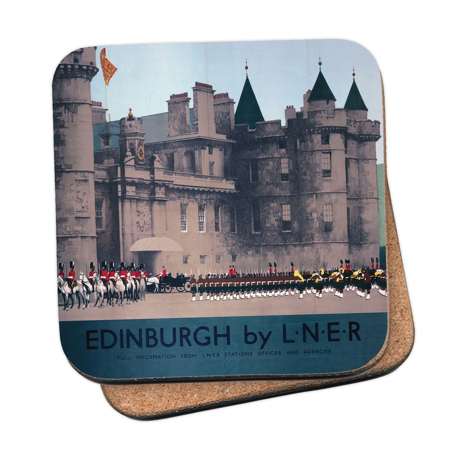 Protect your table surfaces with these durable cork coasters. Beautiful design of The Palace Of Holyroodhouse - Edinburgh by LNER. Perfect for any Railway Posters enthusiast.