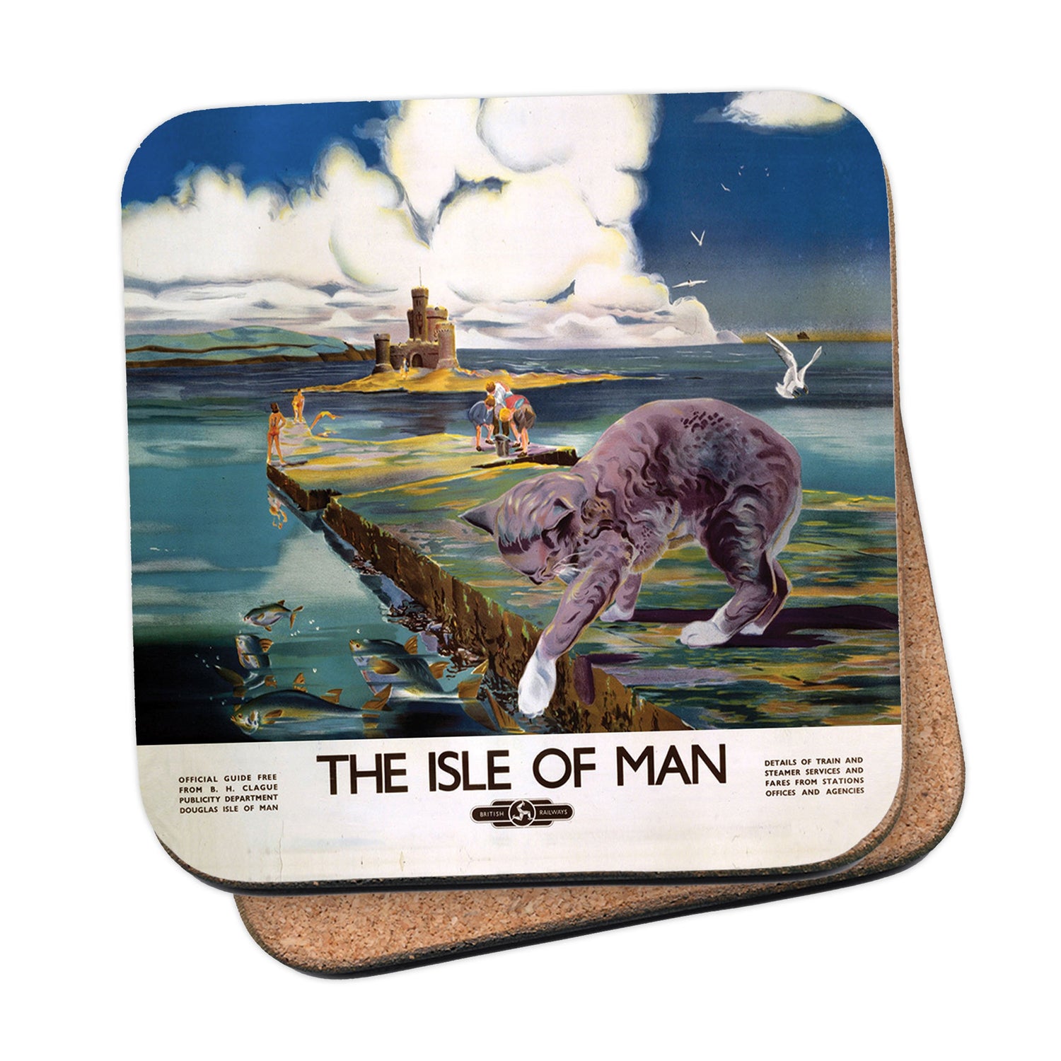 Protect your table surfaces with these durable cork coasters. Beautiful design of Cat Fishing - The Isle Of Man. Perfect for any Railway Posters enthusiast.