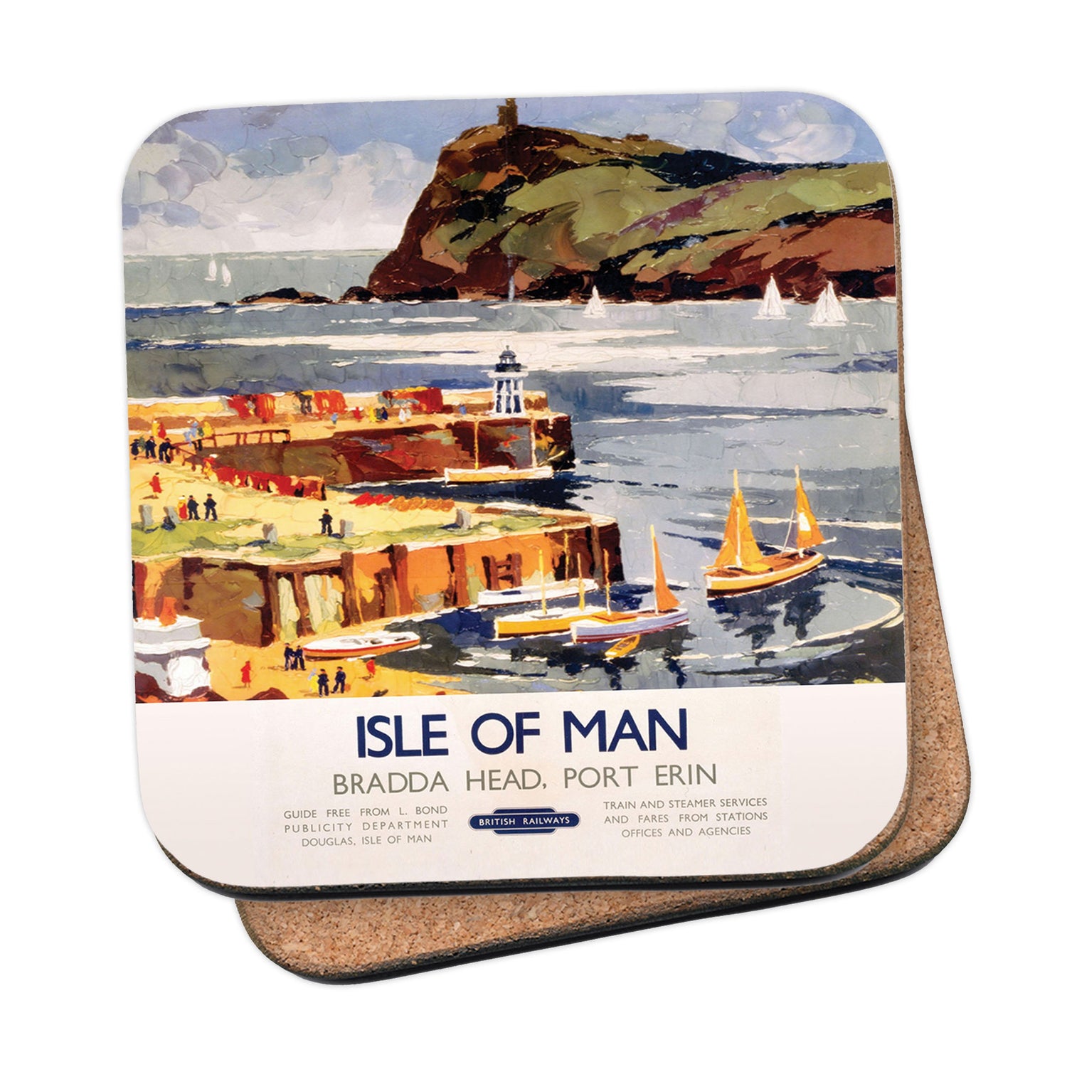 Protect your table surfaces with these durable cork coasters. Beautiful design of Bradda Head, Port Erin - Isle Of Man. Perfect for any Railway Posters enthusiast.