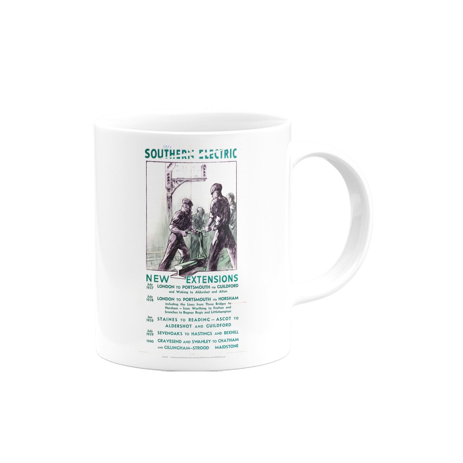 Your favourite Vintage Railway Poster design on a mug. This design of New Extension Dates - Southern Electric is perfect for a nice cup of tea or coffee. Great as a gift to any Railway Poster enthusiast.