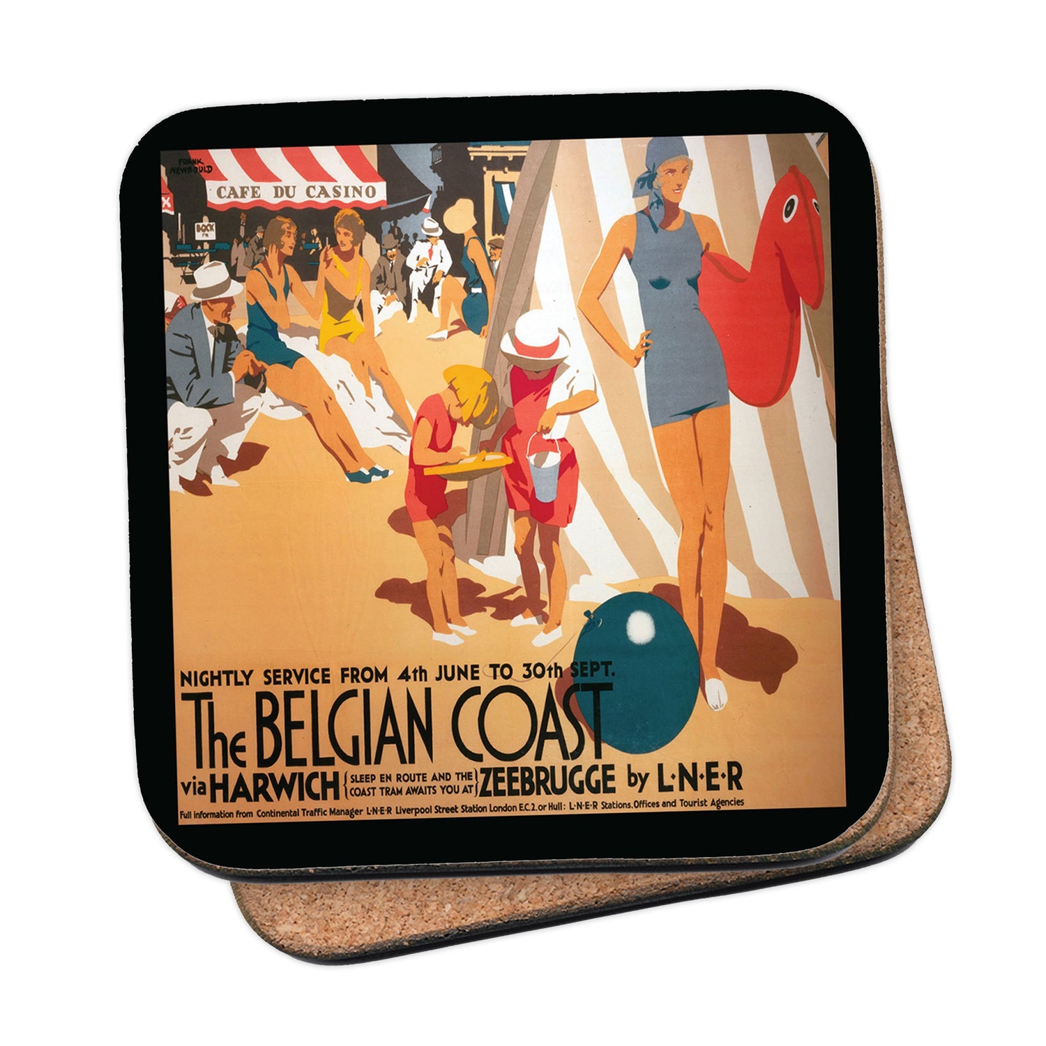 Protect your table surfaces with these durable cork coasters. Beautiful design of The Belgian Coast via Harwich - Zeebrugge. Perfect for any Railway Posters enthusiast.