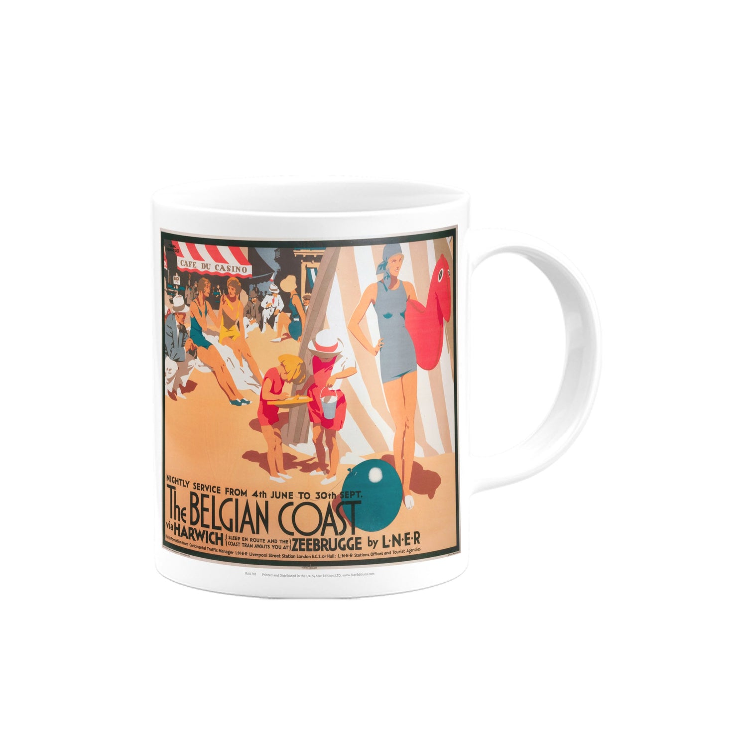 Your favourite Vintage Railway Poster design on a mug. This design of The Belgian Coast via Harwich - Zeebrugge is perfect for a nice cup of tea or coffee. Great as a gift to any Railway Poster enthusiast.