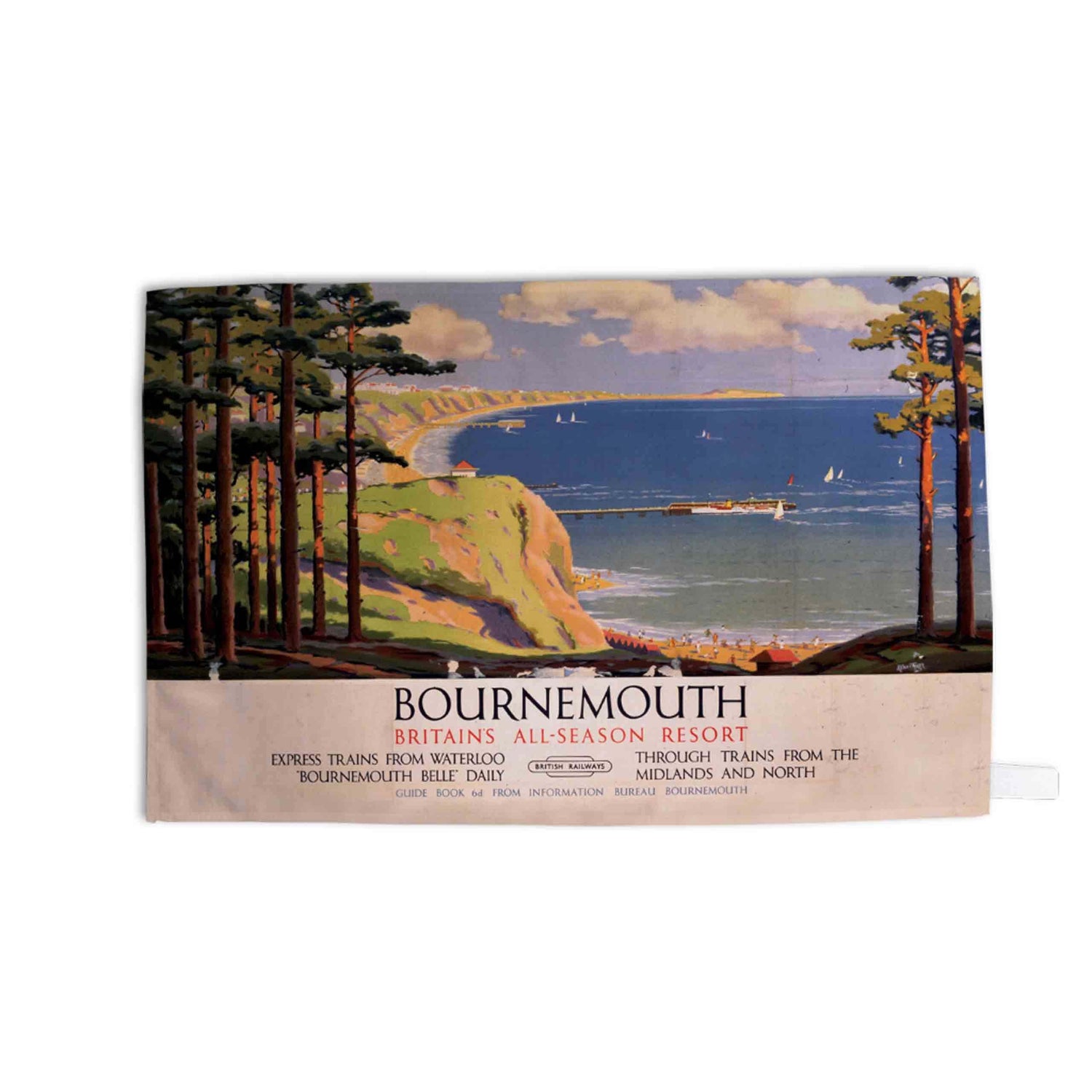 Classic Railway Poster Design on high-quality Tea Towel. This vintage rail design of Bournemouth - Britains all season resort will look great in any kitchen. All made from 100% cotton and hemmed on all four sides along with a handy hanging loop.