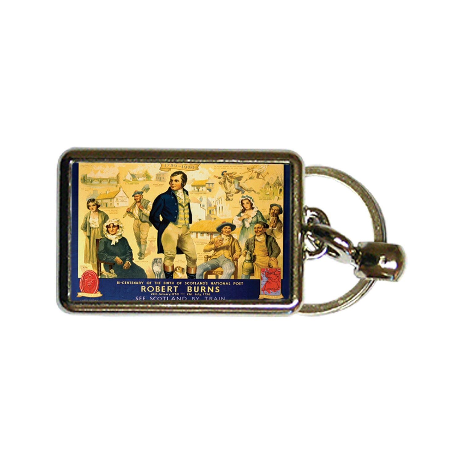 Vintage Railway Poster Keyring of Robert Burns - See Scotland by Train. Keyfob measures 4x3cm. Proudly printed in the UK.