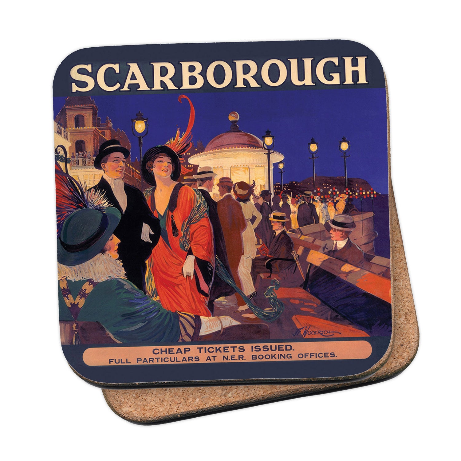 Protect your table surfaces with these durable cork coasters. Beautiful design of Scarborough - Nightlife at the seafront. Perfect for any Railway Posters enthusiast.