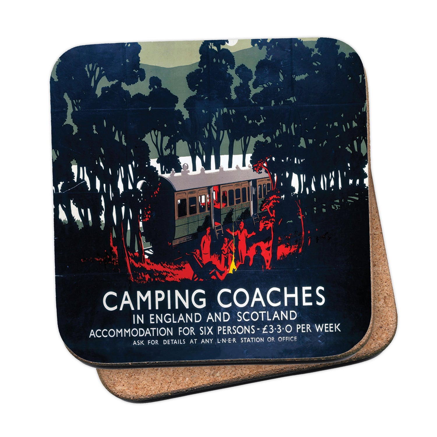 Protect your table surfaces with these durable cork coasters. Beautiful design of Camping Coaches, England and Scotland. Perfect for any Railway Posters enthusiast.