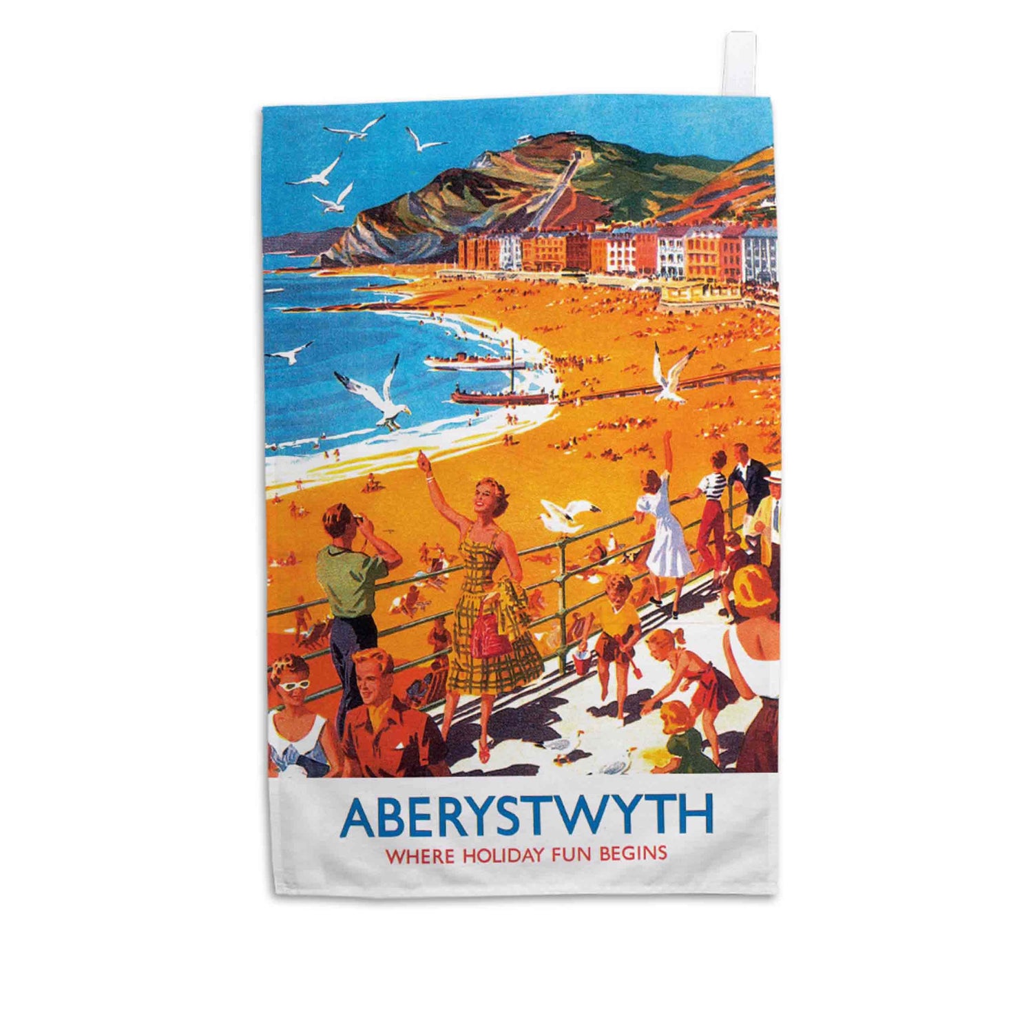 Classic Railway Poster Design on high-quality Tea Towel. This vintage rail design of Aberystwyth - Where Holiday Fun Begins will look great in any kitchen. All made from 100% cotton and hemmed on all four sides along with a handy hanging loop.