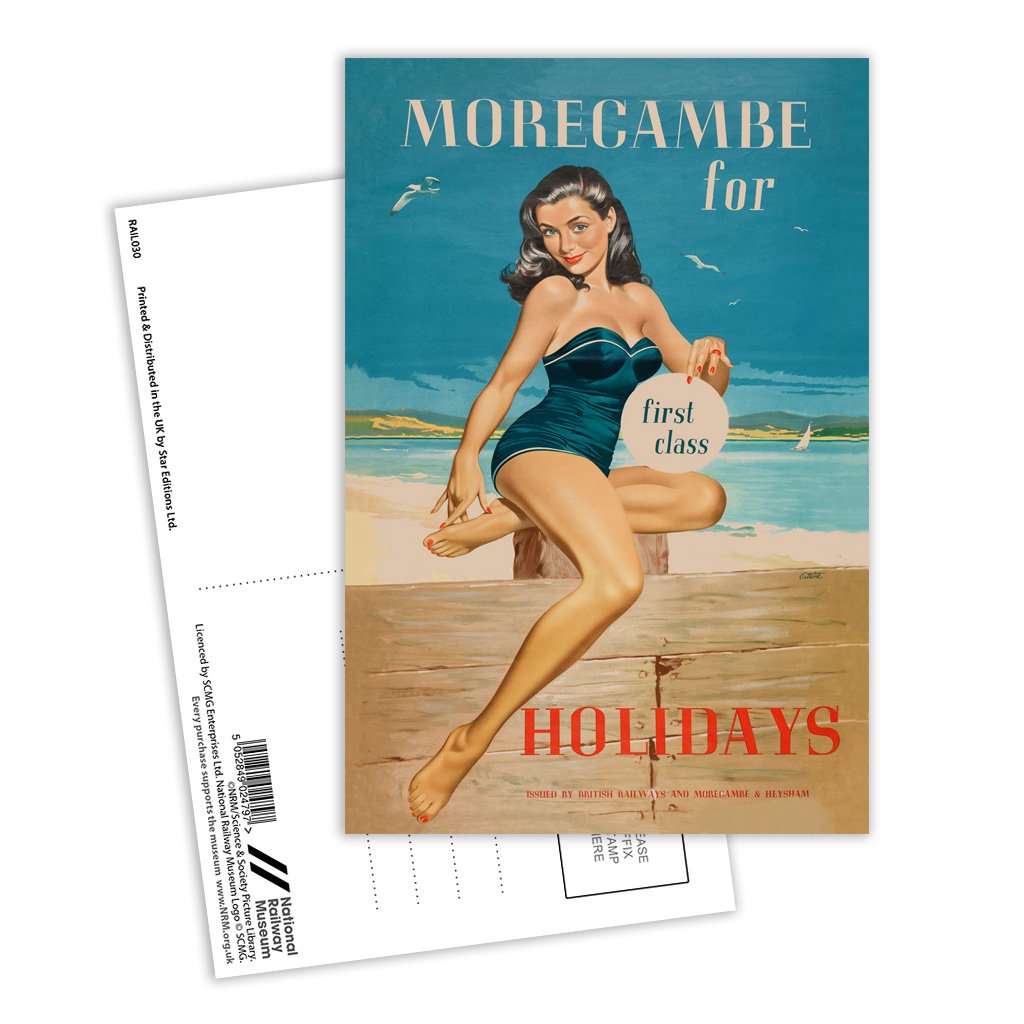 This Vintage Railway Poster postcard pack contains eight postcards. Each printed with the classic poster design of Morecambe for Holidays - 'First Class'. All Railway Poster postcards are made from sustainable materials and is FSC accredited.