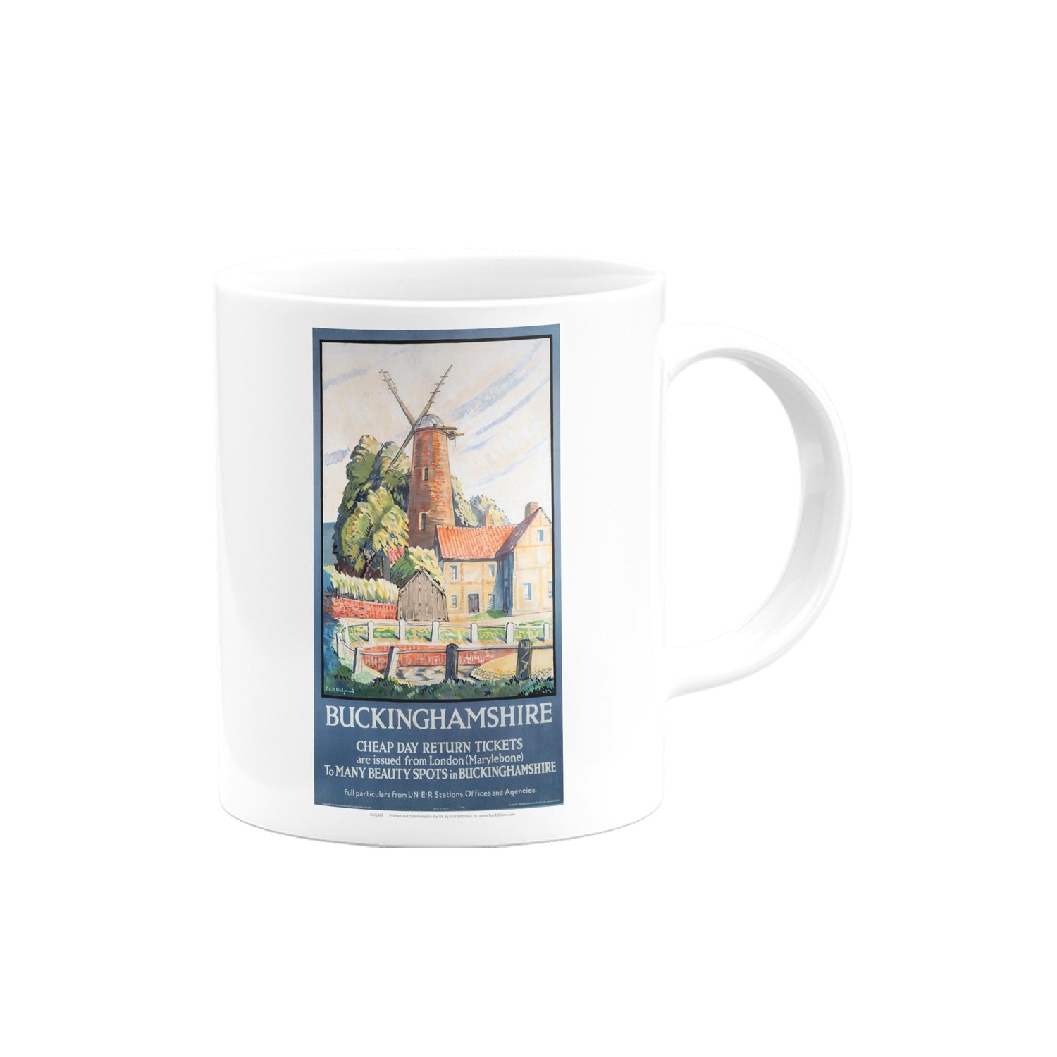 Your favourite Vintage Railway Poster design on a mug. This design of Buckinghamshire - Beauty Spots Windmill is perfect for a nice cup of tea or coffee. Great as a gift to any Railway Poster enthusiast.