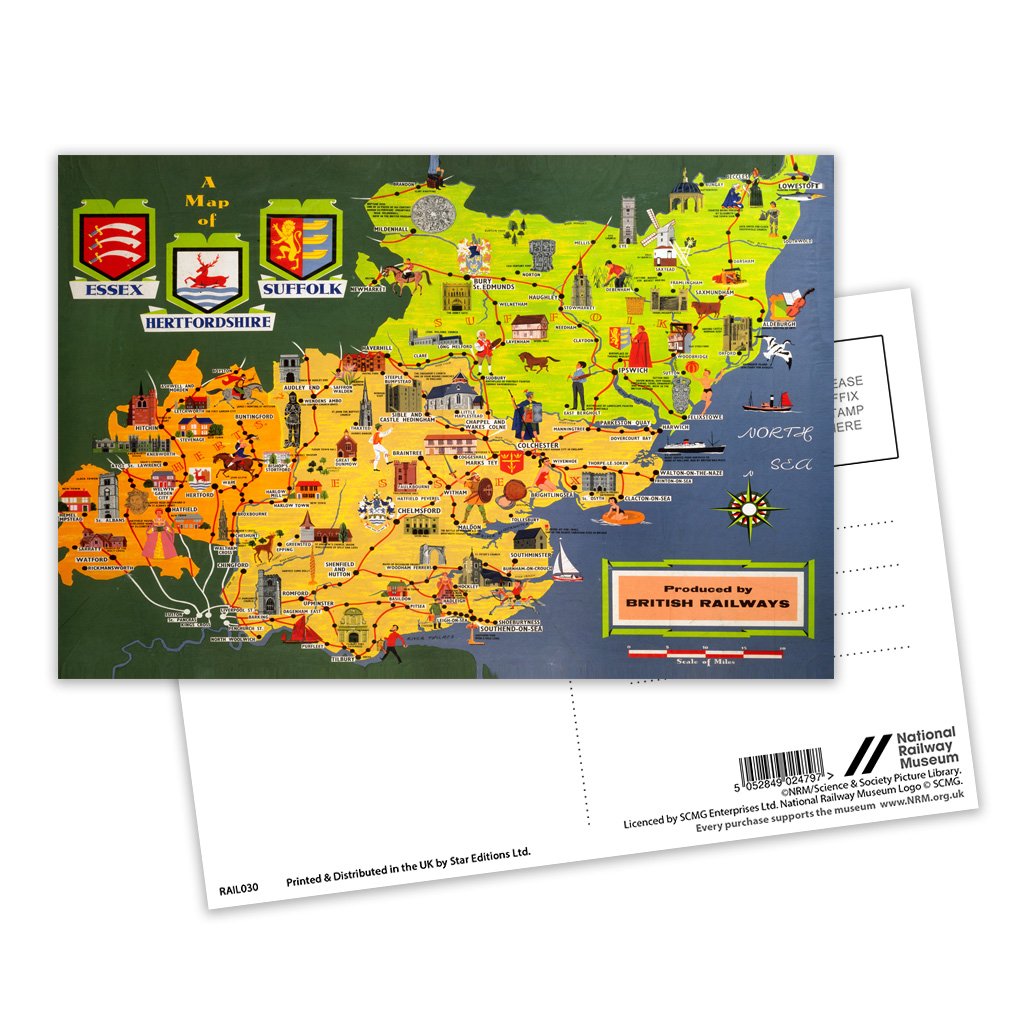 Essex Suffolk and Hertfordshire map - British Railways Postcard Pack of 8