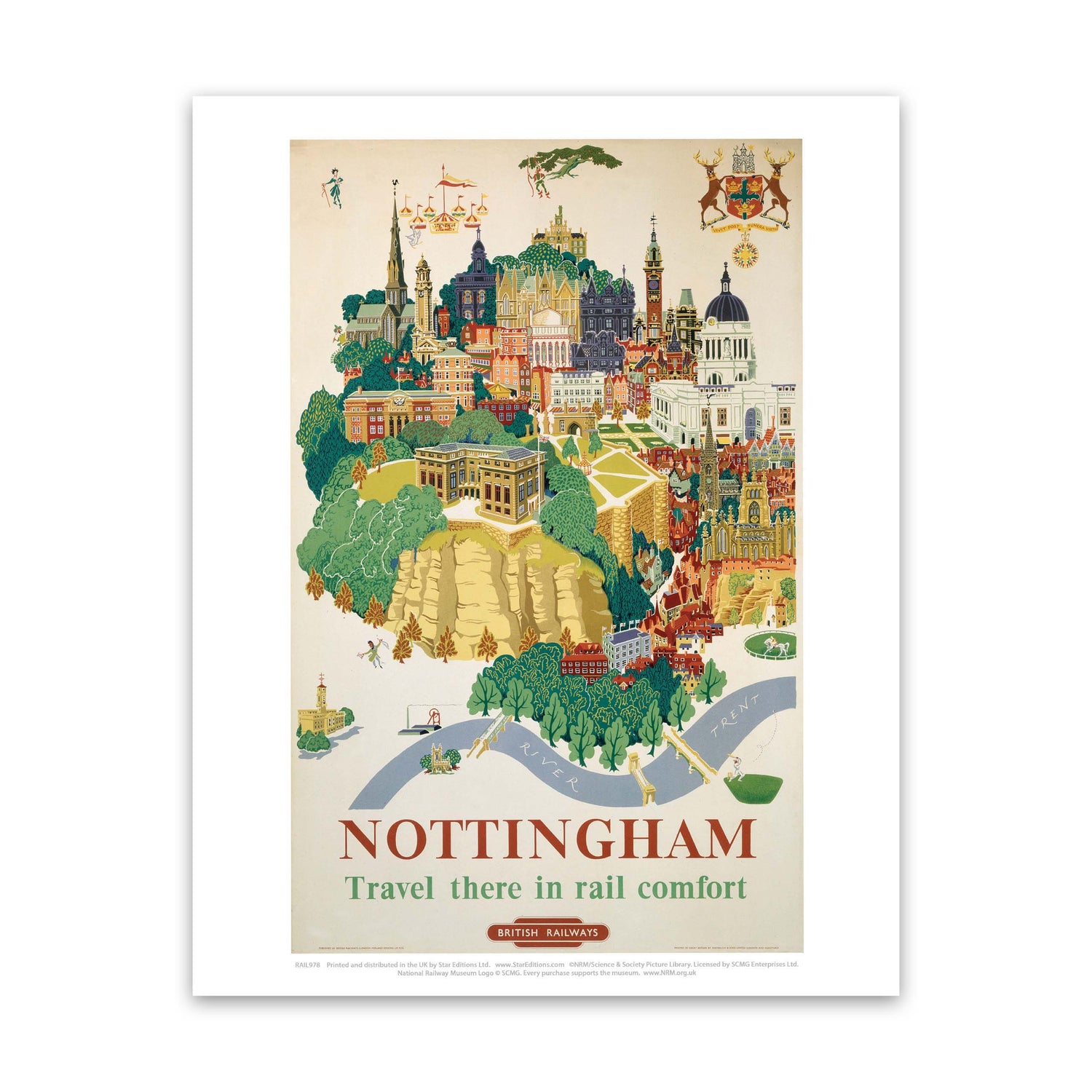 Vintage Railway Poster print of Nottingham BR Poster, 1953. All Railway Posters are printed on high quality eco-friendly paper and are available in multiple sizes. The 11x14 inch sizes are also available with two framed options, perfect to adorn any wall in your home or office.