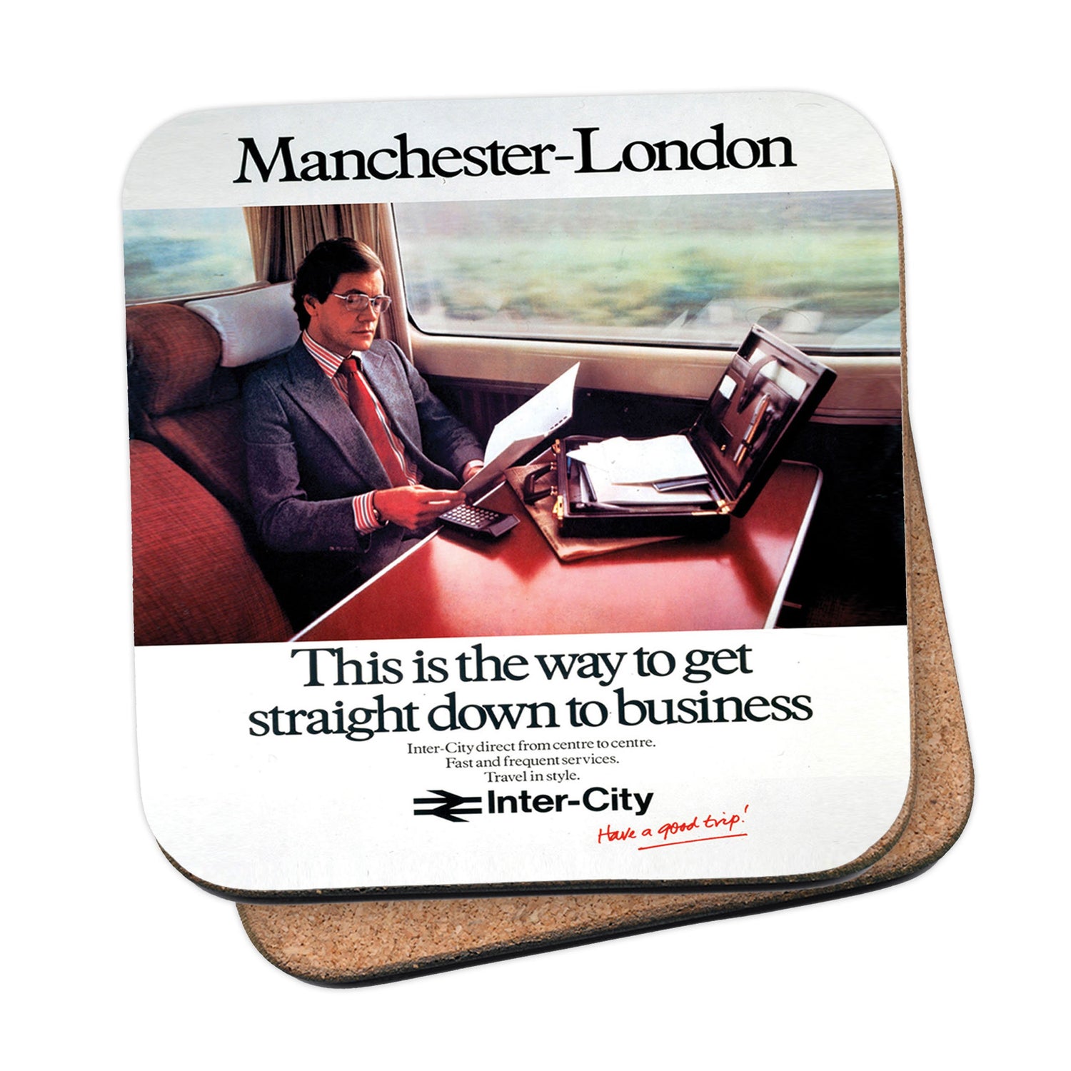 Protect your table surfaces with these durable cork coasters. Beautiful design of Manchester-London, The way straight down to Business. Perfect for any Railway Posters enthusiast.