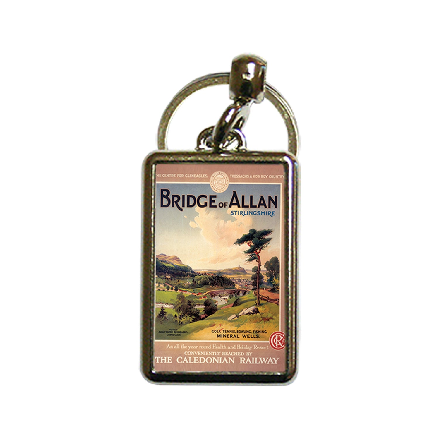 Vintage Railway Poster Keyring of Bridge of Allan, Stirlingshire, Scotland. Keyfob measures 4x3cm. Proudly printed in the UK.