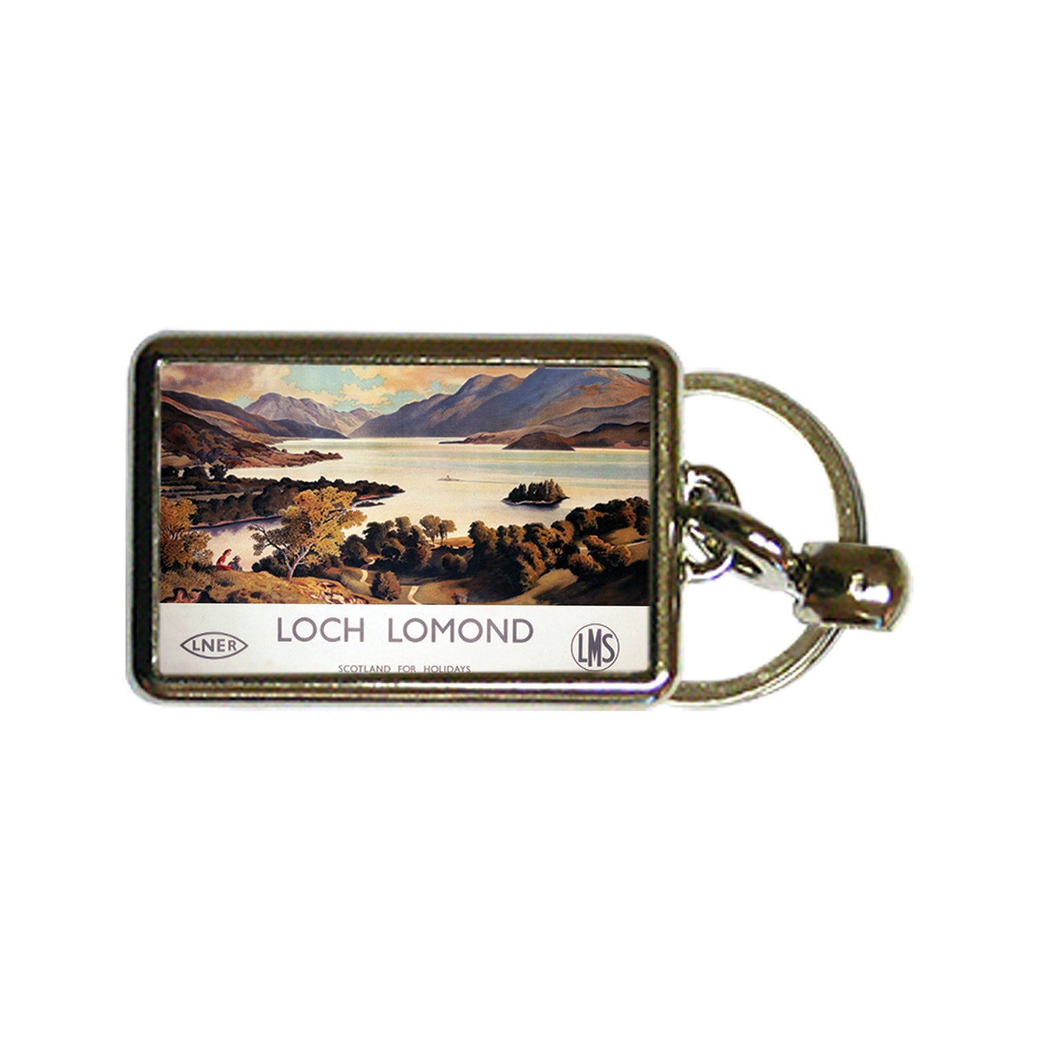 Vintage Railway Poster Keyring of Loch Lomond, Scotland for Holidays. Keyfob measures 4x3cm. Proudly printed in the UK.