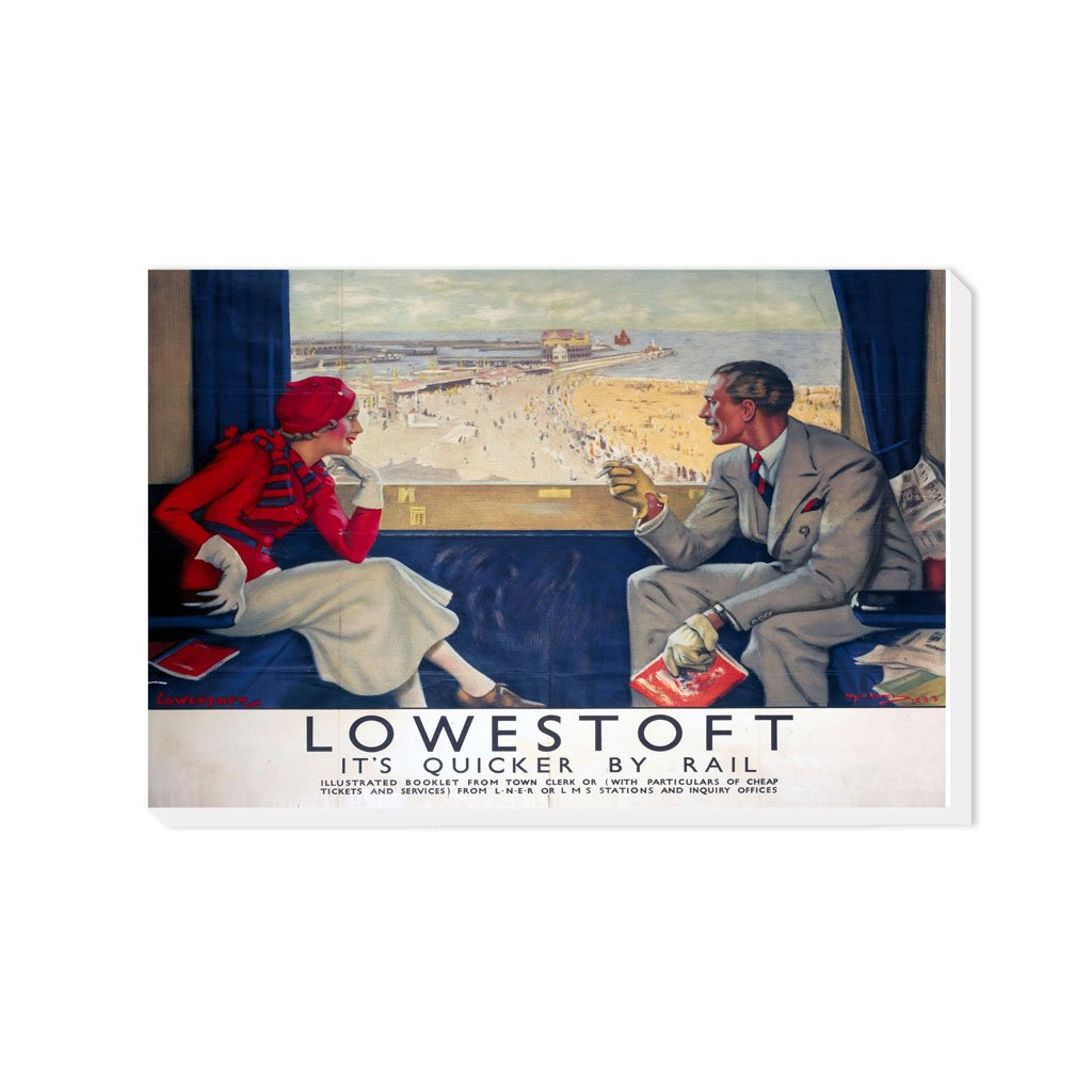 Vintage Railway Poster Canvas Wall Art of Lowestoft It's Quicker By Rail - Carriage View. Canvases are available in multiple sizes and are all made from eco-friendly FSC accredited materials. All Railway Poster Canvases are made of the best quality materials and are proudly printed in the UK
