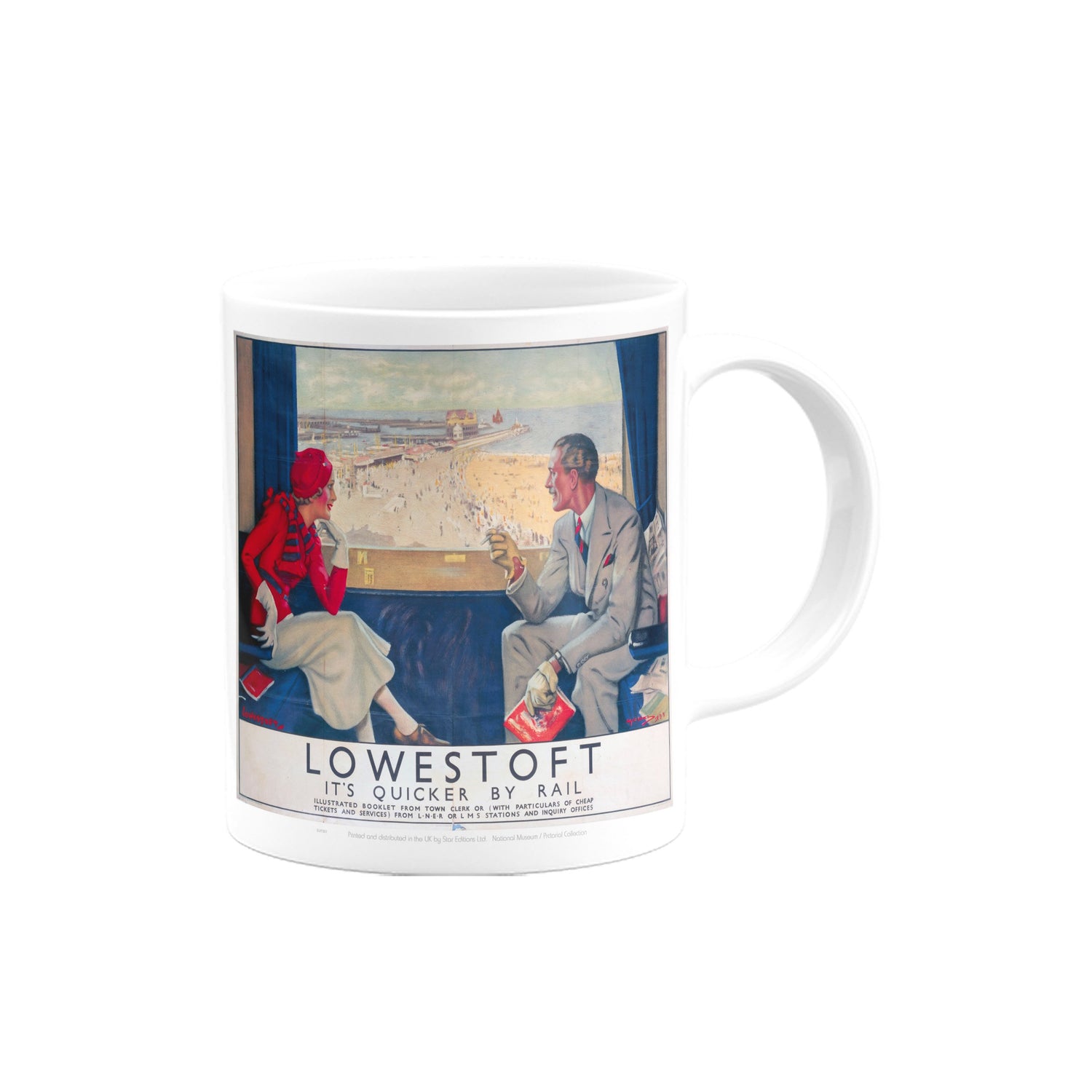 Your favourite Vintage Railway Poster design on a mug. This design of Lowestoft It's Quicker By Rail - Carriage View is perfect for a nice cup of tea or coffee. Great as a gift to any Railway Poster enthusiast.