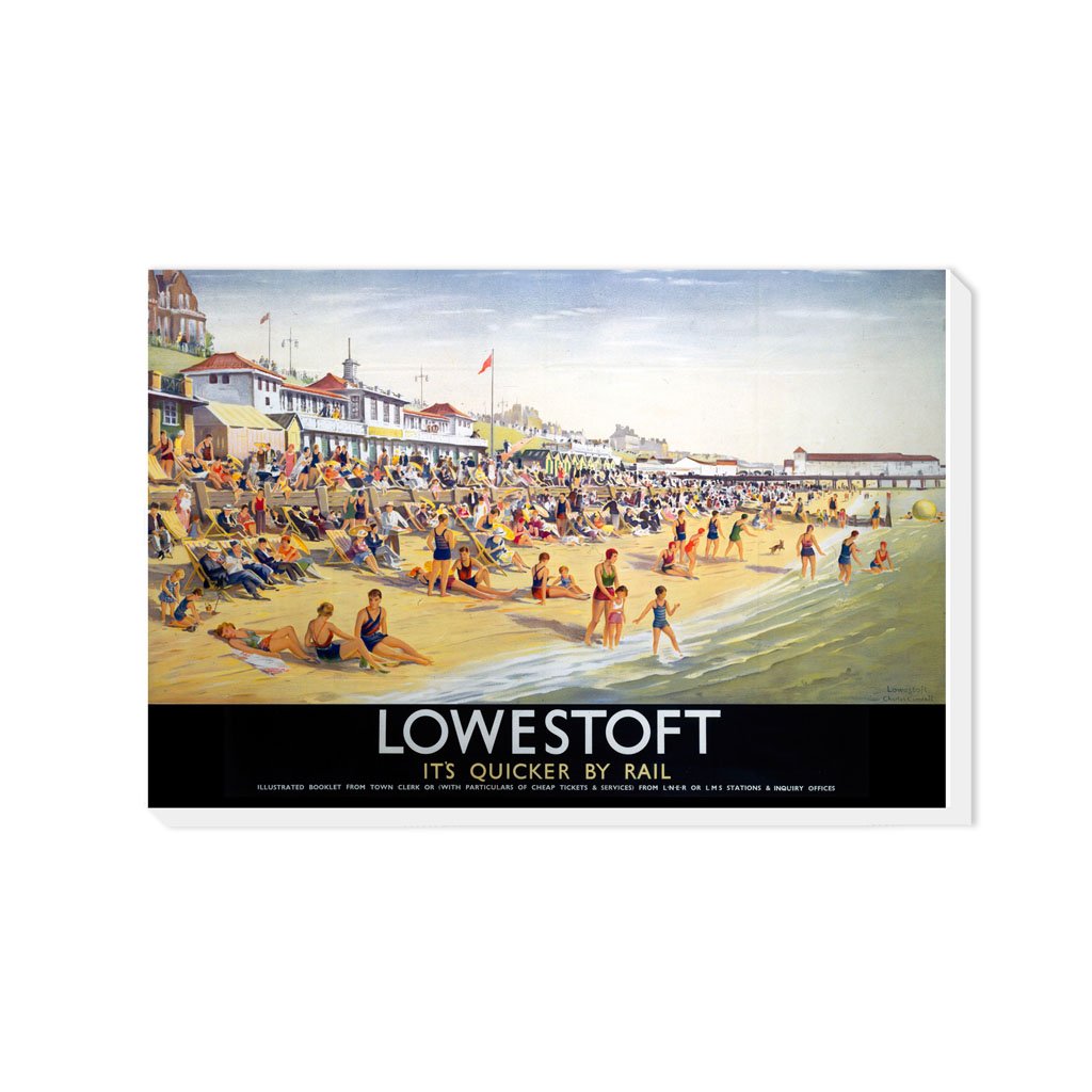 Vintage Railway Poster Canvas Wall Art of Lowestoft - It's Quicker By Rail. Canvases are available in multiple sizes and are all made from eco-friendly FSC accredited materials. All Railway Poster Canvases are made of the best quality materials and are proudly printed in the UK