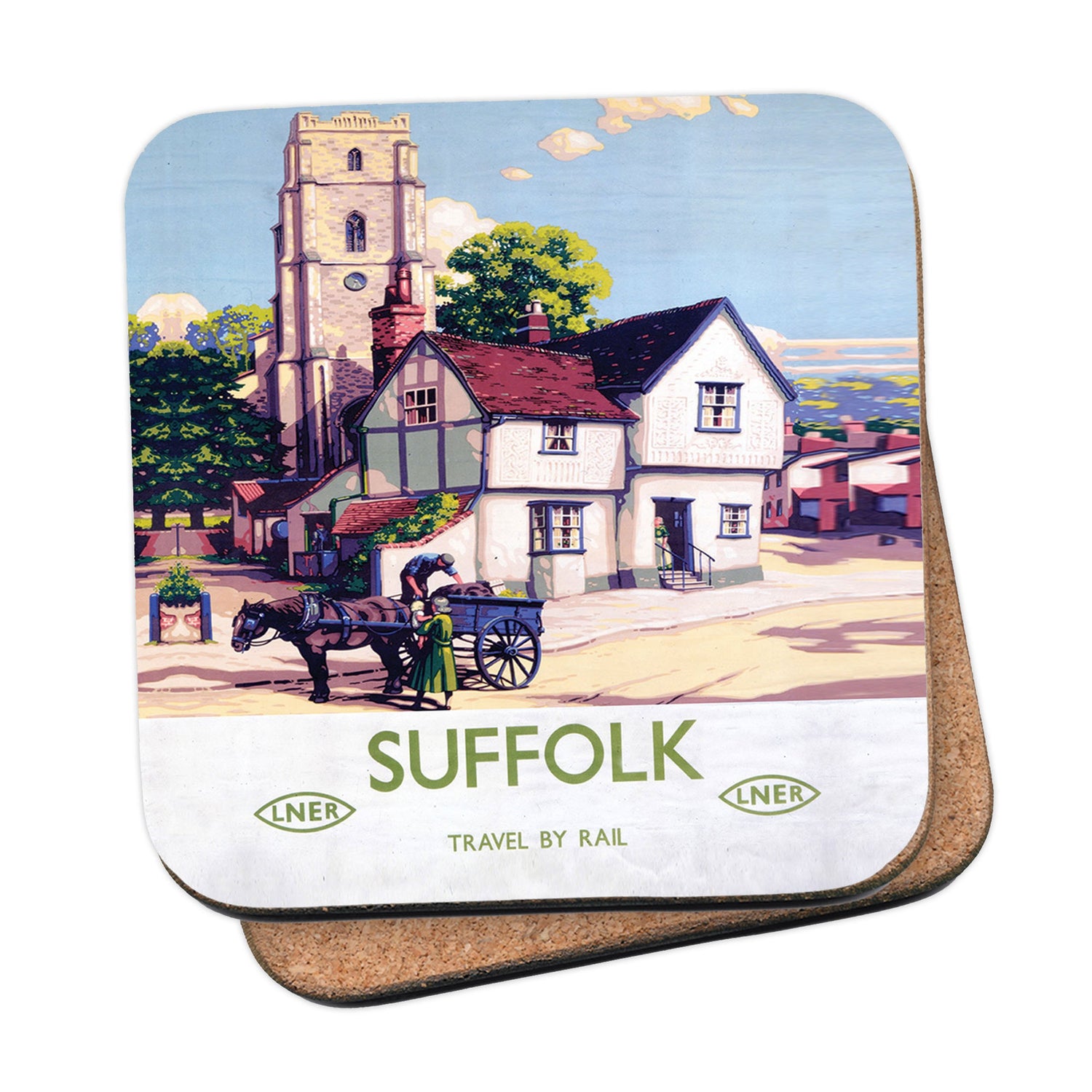 Protect your table surfaces with these durable cork coasters. Beautiful design of Suffolk Travel By Rail LNER. Perfect for any Railway Posters enthusiast.