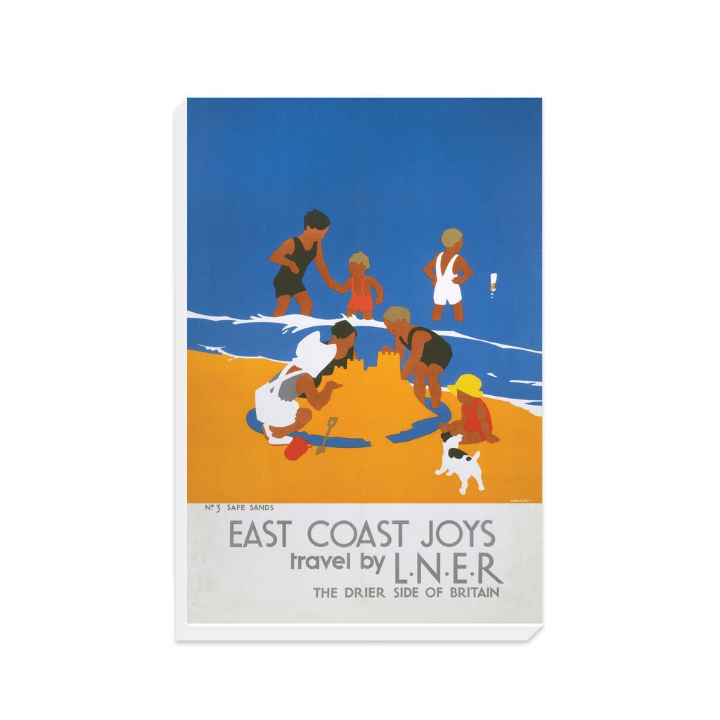 Vintage Railway Poster Canvas Wall Art of East Coast Joys No 3 Safe Sands. Canvases are available in multiple sizes and are all made from eco-friendly FSC accredited materials. All Railway Poster Canvases are made of the best quality materials and are proudly printed in the UK