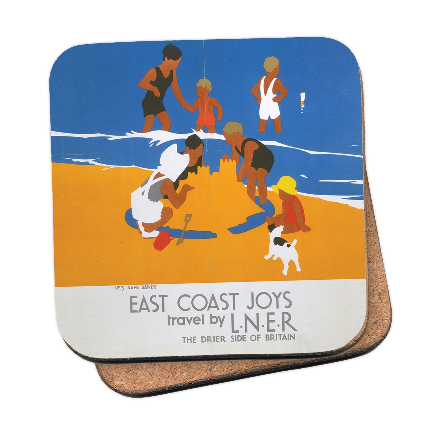 Protect your table surfaces with these durable cork coasters. Beautiful design of East Coast Joys No 3 Safe Sands. Perfect for any Railway Posters enthusiast.