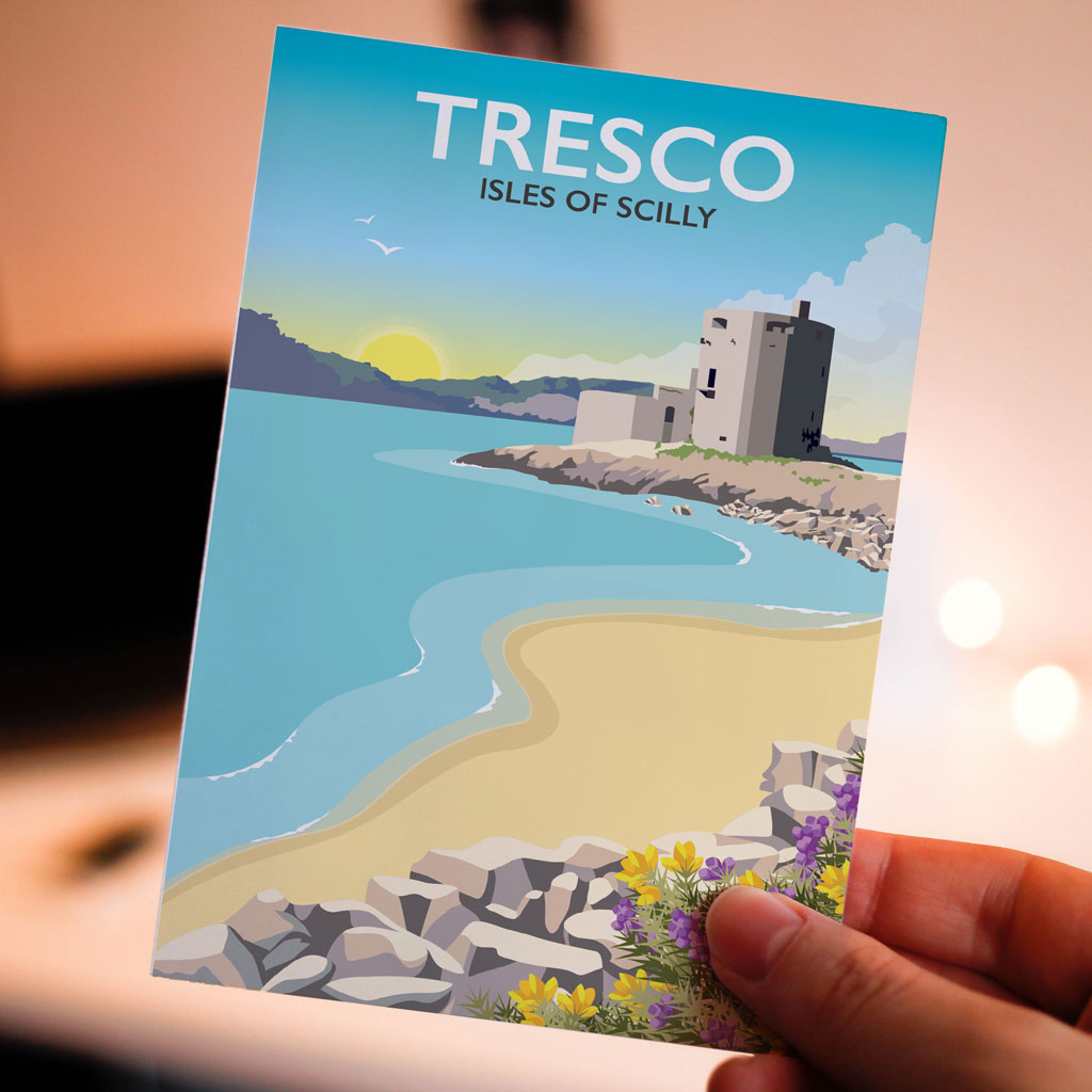 Inspired by travel and wartimes posters of the past, Tabitha Mary has created this wonderful image of Tresco, Isles of Scilly, Cornwall